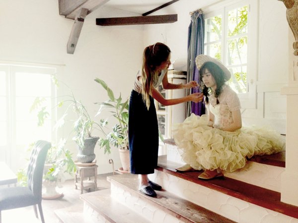 山奥でのロケ、メイク中のぱるる。このときの撮影を、「お人形さんのような衣装でぶどうを一粒一粒、おいしそうに食べる姿に胸キュン❤︎ でした」と担当編集は振り返ります。
