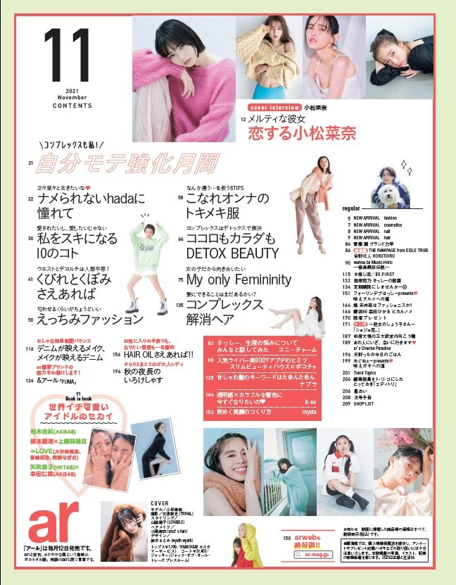 MAGAZINE 公開日 2021.10.11 / 更新日 2021.10.11 AUTHORarweb編集部 ar11月号 小松菜奈さんが表紙のar11月号!中身をチラ見せ❤ SHARE arなりに真剣に考えた! コンプレックスとの向き合い方