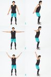手のひらを内側にし、全身で“Y”の形になるように腕を斜め上にまっすぐ伸ばす。手が肩の位置より後ろへ引くイメージで背中に効いているのを感じたら、またAのポーズへ。1~3のポーズをていねいに15回行う。