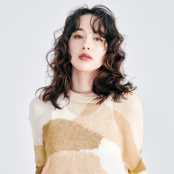 色気はダダ漏れているけど決して甘くならない強くてクールビューティなミディパーマ。顔まわりにニュアンスを出すために、やや前上がりでカットし、太めのロッドで根元からしっかりと強めにパーマをかける。毛束をほぐしてからスタイリングすることでドライな質感に仕上げ、辛口な表情に。モデル/小山エマさん