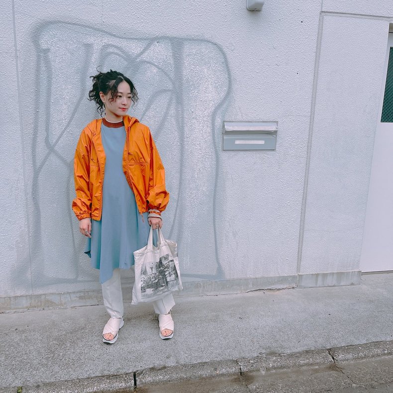 「首元のライン切り替えがスポーティーなブルーワンピとオレンジブルゾンの組み合わせが着映え感抜群。ワンピの下に仕込んだ白パンですっきり都会的な印象に。」