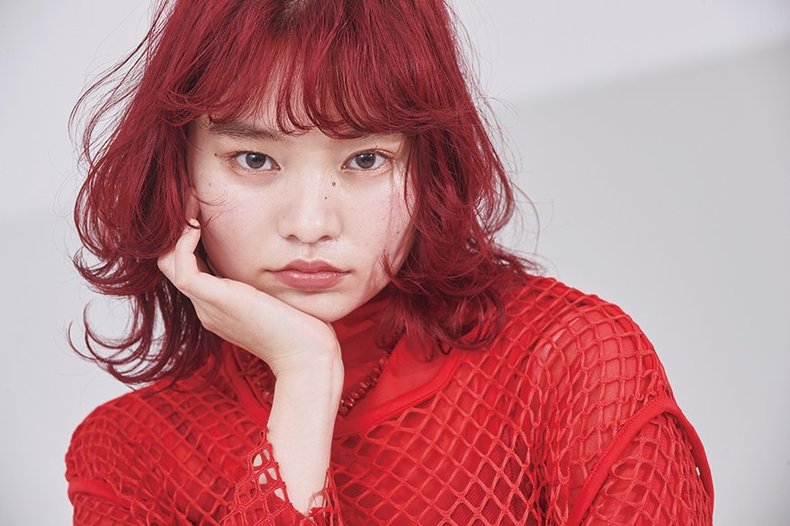サッカーファンもそうじゃなくても、気分転換したい時にはマンチェスターUのチームカラー・レッドの出番! ライトナー+10%のブリーチ剤でリフトアップし、チェリーレッドのカラー剤、赤のカラートリートメントの重ね塗り。ウキウキ感が乗り移ったような奔放な毛束も可愛い。モデル/高橋咲帆さん