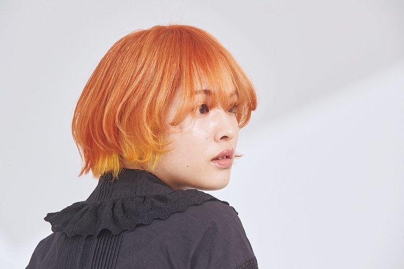 ジューシーなビタミンオレンジは、レモンカラーをバランスよく組み合わせることでキャラっぽさをセーブしつつ抜け感をイン。ブリーチ後、もみあげとバックの耳下はイエロー、それ以外を発色のいいペールオレンジでカラー。前髪長めボブのクール感が緩和され、ヘルシーキュートな印象に。モデル/mayaさん