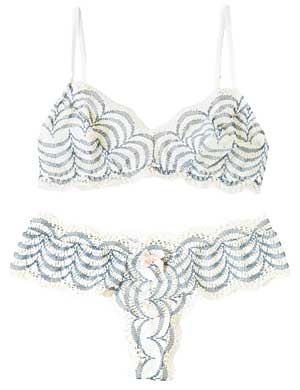 淡ブルー×白の配色は清潔感があってスポーティ。丸みのある変則的なボーダー柄と愛らしいスカラップデザインが甘さを、ニットレースの透け感が色気もキープ。あくまで快活セクシーなバランス感がカギ。ブラ¥9,300、ショーツ¥7,100/エバージェイ(ル・シャルム・ドゥ・フィーフィー・エ・ファーファー)