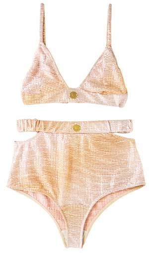 オレンジがかったベージュラメは、肌のくすみをオフする効果あり。ハイウエストのでかパン(サイドに小窓!)にも胸きゅん。モンスターファーブーツとの組み合わせテクは永久不滅のおしゃれアイコン、クロエ・セヴィニー嬢より拝借。ブラ¥19,000、ショーツ¥18,000/クリスソニック(ラ・アンヘリータ) ファーブーツ¥80,000/ジャンティーク