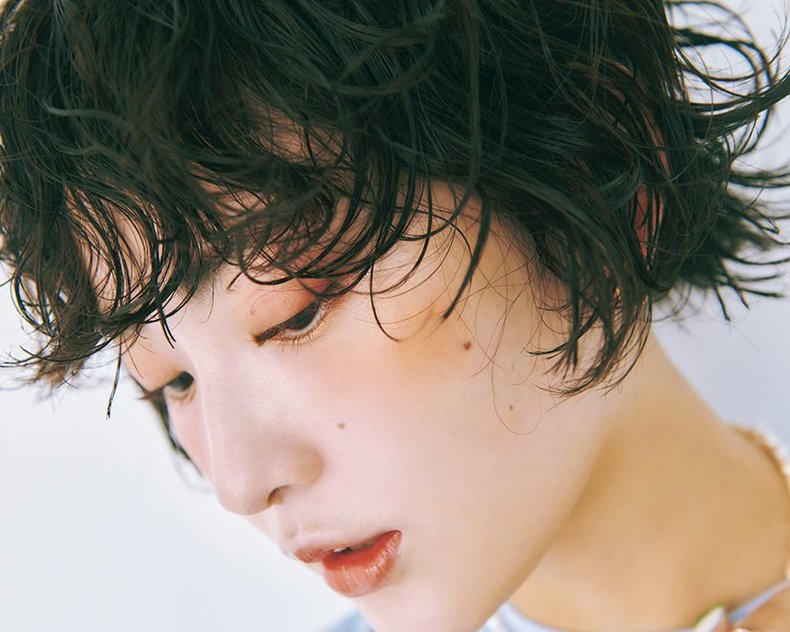 ヘタすると老けて見えがちな強めパーマは、顔まわりに動きとヌケ感をつくるのが何よりも大事。ボブをベースにトップから顔まわりに段を入れ、全体に細かめにミックススパイラルを。前髪、耳まわりを中心にランダムな動きを出し、カジュアル仕立てに。