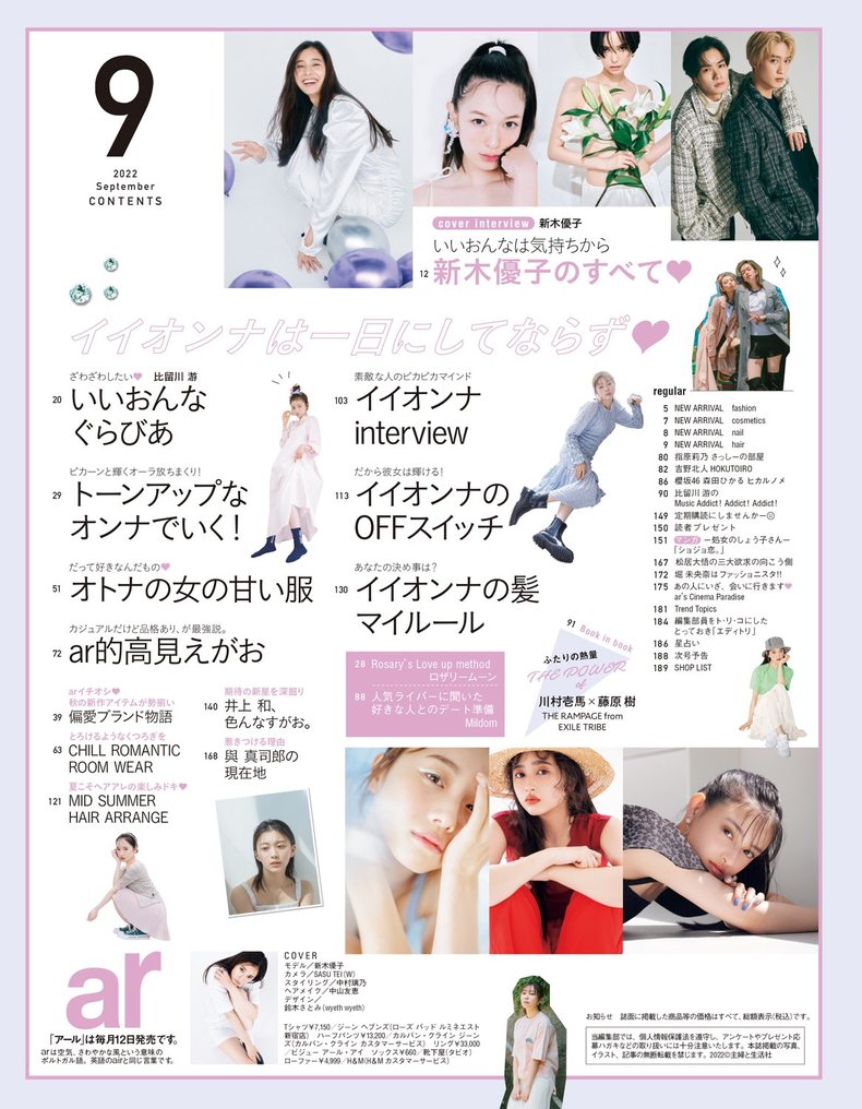 MAGAZINE 公開日 2022.8.10 / 更新日 2022.8.10 AUTHORarweb編集部 ar9月号 ar9月号は”いい女”号。いい女は1日にしてならずなのです! SHARE ar9月号は「いい女」号! 自分を磨くメソッドが満載ですよ♡ (表紙記事のチラ見せはコチラ )新木優子、ar9月号でアンニュイな濡れ髪姿を披露♡ 「30歳が一番いい年になるんじゃないかな」29歳の彼女が持つ未来への希望は?