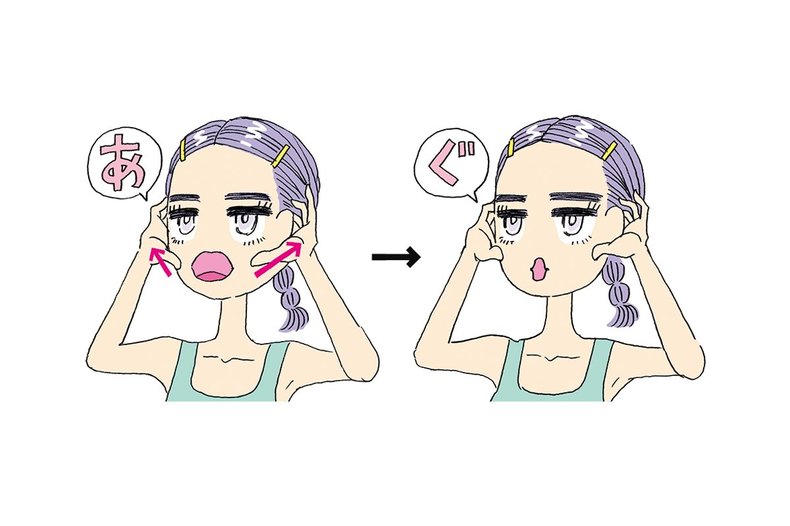 2. 頬骨の約1.5㎝下から、親指の腹で斜め上に圧をかけながら「あ・ぐ・あ・ぐ」と口を大きく開閉する。