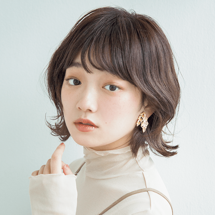 紫外線を受けて傷んだ髪を健康的に見せ、かつ透明感と色気を呼び込むのが、ブラウンとラベンダーをMIXした"ブランダー"。カットはぱっつんボブに頬からのハイレイヤーで顔まわりにニュアンスを出し、重めバングで目力を強調する。
