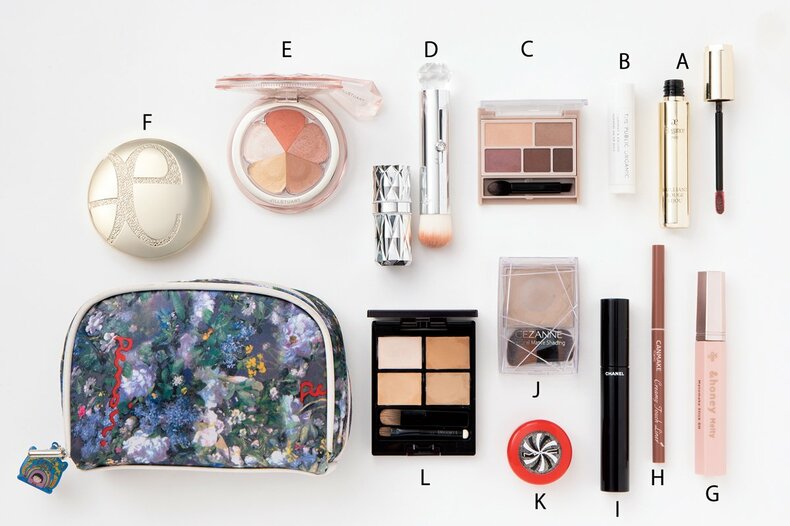 「とりあえずこのセットを持っていけば、その日の雰囲気に合わせてメイクできる万能コスメたちをセレクト。ちなみに、相方(中込悠さん)にコスメのおさがりをあげて「ショートカットのママ」などエレガント人生のコントに活用することも。美術館で購入したモネのポーチに大好きなさくらももこのチャームをつけて持ち歩き中。」