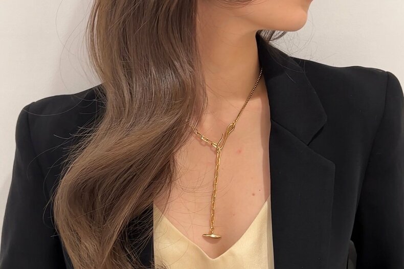購入したのはゴールドのネックレスなのですが、ブレスレットとしても使えたり、前後ろ逆にしても使えるというオールマイティなアイテム。