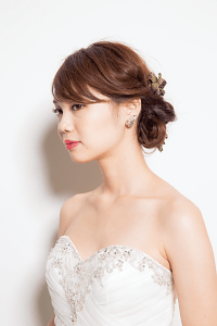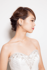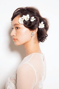 「うちのお嫁さん、上品でしょ」彼ママも大満足間違いなしな華やかビューティヘア。サイドをねじって顔を出し、凛とした印象に。シンプルに見えすぎないように、花をまとって華やかに仕上げ、9:1で斜めに流した前髪をタイトにまとめて、レトロ感たっぷりに♪