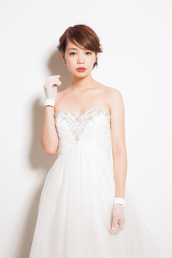 ドレス¥270,000(レンタル価格)/サムシング・ブルー イヤリング(参考商品)/シンプリーレッド グローブ(参考商品)/ミーチェ