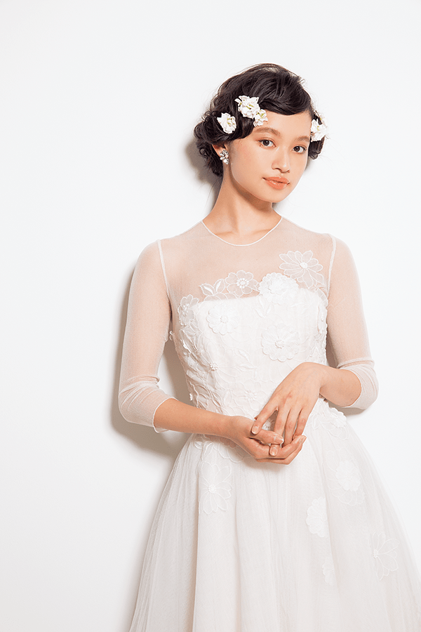 ドレス¥220,000(レンタル価格)/ミーチェボンネ¥7,000(レンタル価格)/ロジィ アプロディーナ(ブランコビアンコ) イヤリング¥5,000(レンタル価格)/アーネラクロージング