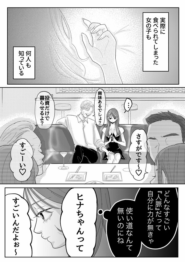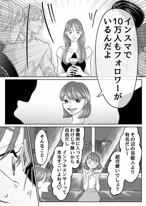 前回のあらすじ PR会社に勤める橘カレン(27)は、東京で努力を重ねる「インフルエンサー」。イケメンインフルエンサー・レオから「うち、寄ってきなよ」と半ば強引に誘いを受けるも、ハイスペックな彼が自分を選ぶ理由がわからず戸惑ってしまう。意を決して問いただすも屈辱的な返答に感情を抑えきれず、その場を後にするカレン。 その直後、カリスマインフルエンサー・ヒナから一本の電話が。今まさにカレンを炎上に追い込んでいる"女王蜂"の正体を知ってると連絡がきて…!?