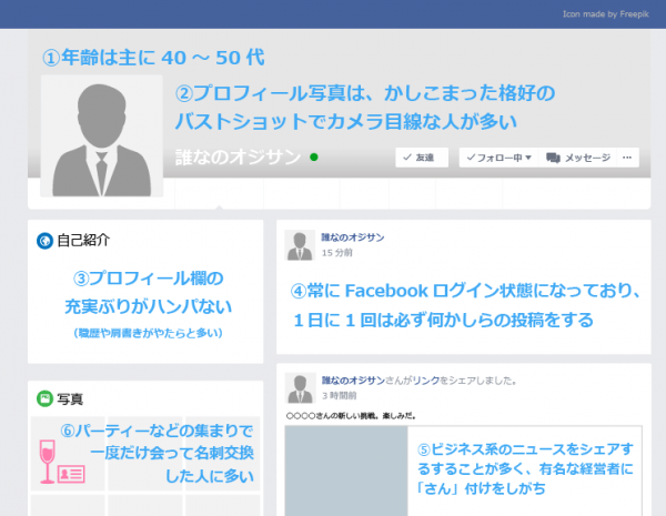 この他にも、「名刺に顔写真が入りがち」「人のタイムラインに書き込みしてきがち」「リッチというわけではなさそうだけど、貧乏でもなさそう」といった特徴が聞かれました。
