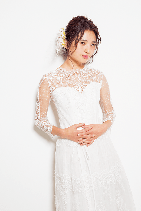 ドレス¥400,000(オーダー価格)、¥240,000(レンタル価格)/アーチェロマリアージュ バレッタ¥1,800/アネモネ(サンポークリエイト) コーム¥2,000/(レンタル価格)ダイアンリー