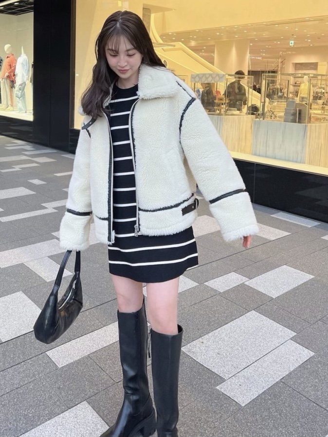 (左)ライダースジャケットの持つクールな印象が、もこもこ素材&オーバーサイズで中和され究極の甘辛ミックスが実現。