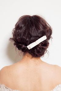 片サイドから毛束をねじって逆サイドでまとめ、毛先を丸めてゆるめのシニヨンに。