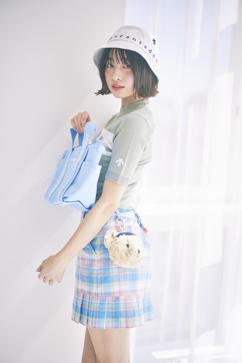 ヒップにクマちゃんモチーフのボールポーチを添えたスウィーティーなチェックミニを、すっきりとコンパクトなカーキニットで大人っぽくクールダウン。胸元に入ったクリーンなホワイトのライン切り替えが都会的なアクセントに。