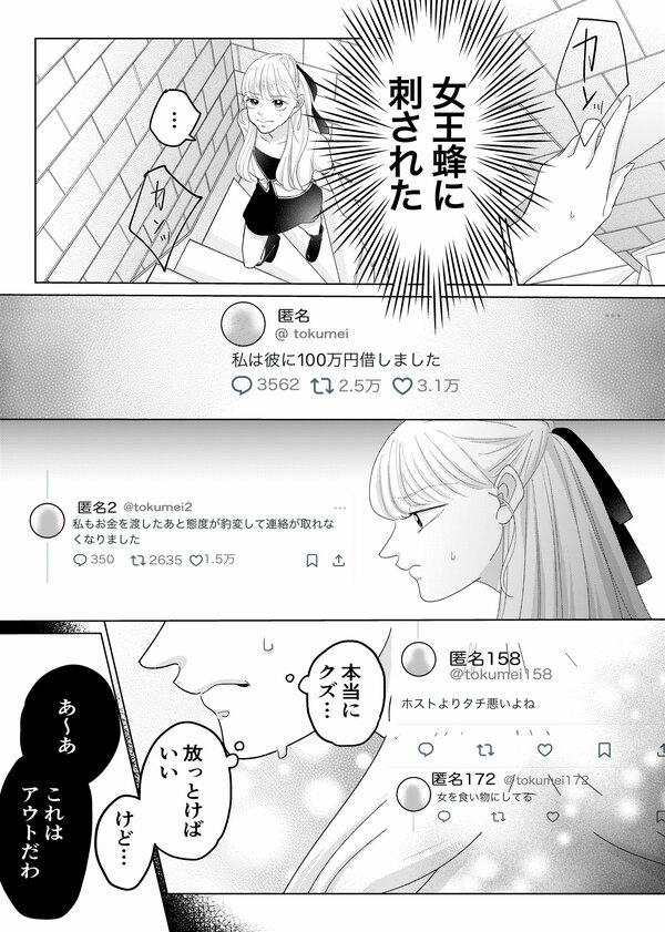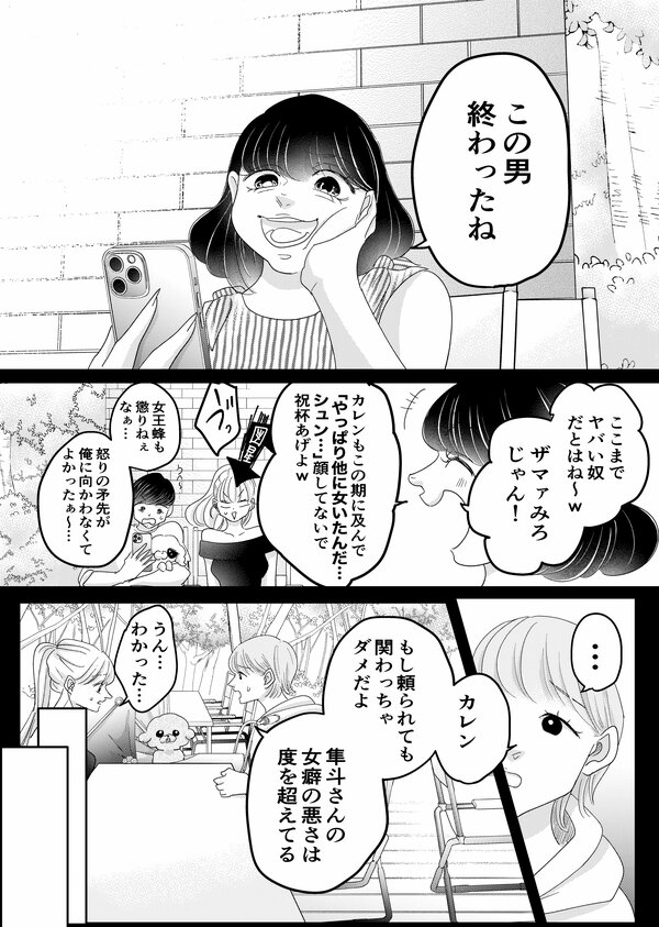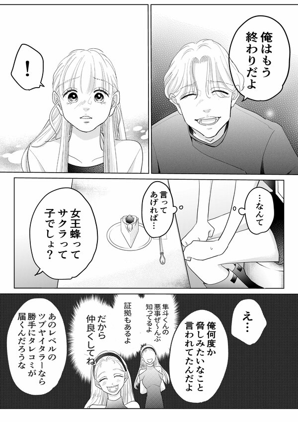 前回のあらすじ:PR会社に勤める橘カレン(27)は、東京で努力を重ねる「インフルエンサー」。無事"女王蜂"から謝罪投稿が上がり平穏な暮らしを取り戻しつつあるカレン。報告がてらいつものメンバーと和気あいあいと過ごしている最中、隼斗から不穏な着信が…! 嫌な予感を抱きつつ話を聞くと、隼斗まで女王蜂の餌食になってしまったようで…!? 動揺する隼斗にカレンはどう答える?