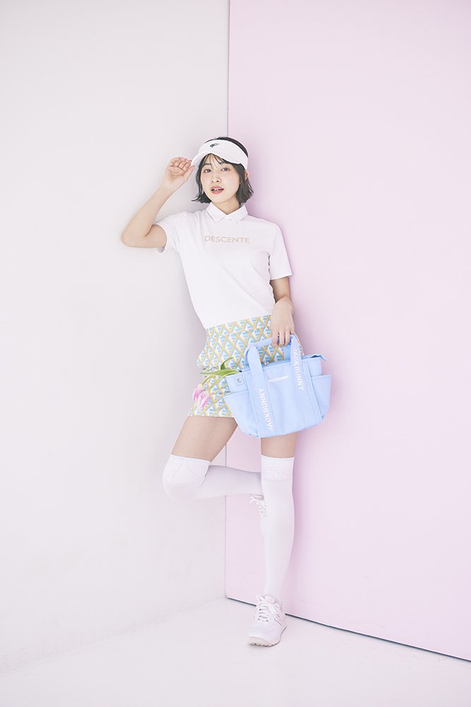 カラフルなジオメトリックプリントがアイキャッチーなミニを、シンプルシックな白シャツでクールダウン。足元やバイザーも白でまとめればぐっと洗練された印象に。ミニの柄のカラーを拾ったカートバッグで奥行きを持たせて。