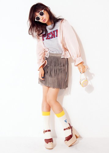 Tシャツ¥5,900/チャンピョン、ソックス¥1,700/ロスター ソックス×ビームス ボーイ(ビームスボーイ 原宿) カーディガン¥18,000/ベリーブレイン(Heavenly) スカート¥33,000/リルリリー(リルリリー トーキョー) サングラス¥5,500、ポーチ¥4,000/ファーファー(ファーファー ラフォーレ原宿店) サンダル¥13,200/スナイデル