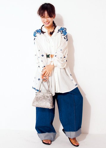 ワンピース¥20,000/スナイデル ベルト¥2,500/ゲバルト バンドウェーボン(ビームス ボーイ原宿) デニム¥42,000/アールト(オープニングセレモニー) バッグ¥15,800/リリシャス(リルリリー トーキョー) サンダル¥12,500/ソル サナ(ジャック・オブ・オール・トレーズ プレスルーム)