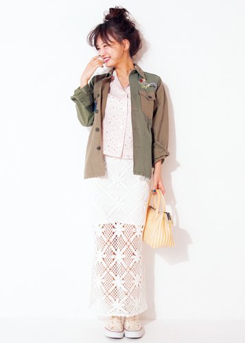 ワークシャツ¥25,000/ソルト ウォーター カウボーイ×レイビームス(ビームス ウィメン 渋谷) 中に着たシャツ¥18,000/オープニングセレモニー ジャパン エクスクルーシブ ライン(オープニングセレモニー) スカート¥4,000/MONKI (MONKI Harajuku) バッグ¥18,000/ガム ジャンニ・キアリーニ デザイン(エス.アイ.エム) スニーカー¥5,300/コンバース(ビームスボーイ 原宿)