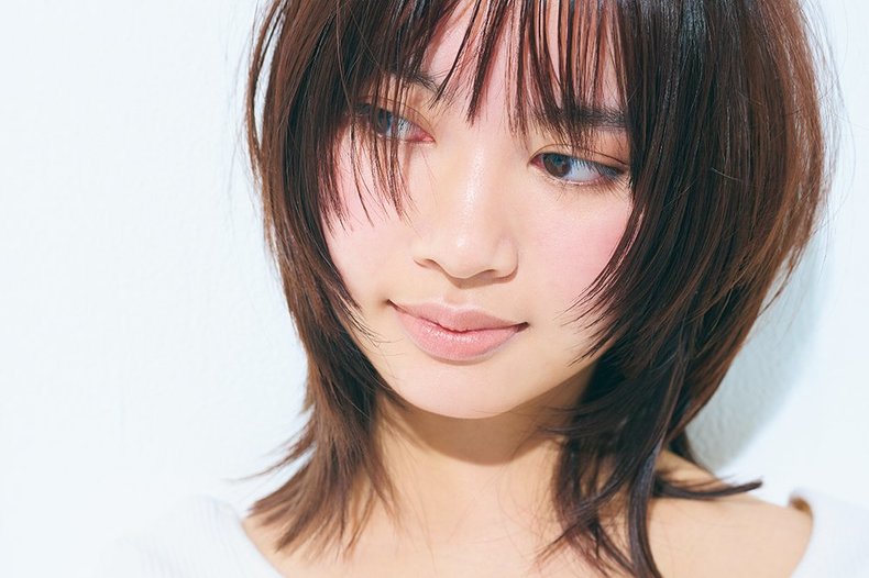 顔を包み込むレイヤーとくびれ感のあるシルエットでメリハリを出した爽やかウルフ。平坦に見えないよう、ひし形の丸み部分の位置を高くするように意識しながらレイヤーを入れ、鼻付近に丸みのあるアクセントを。
