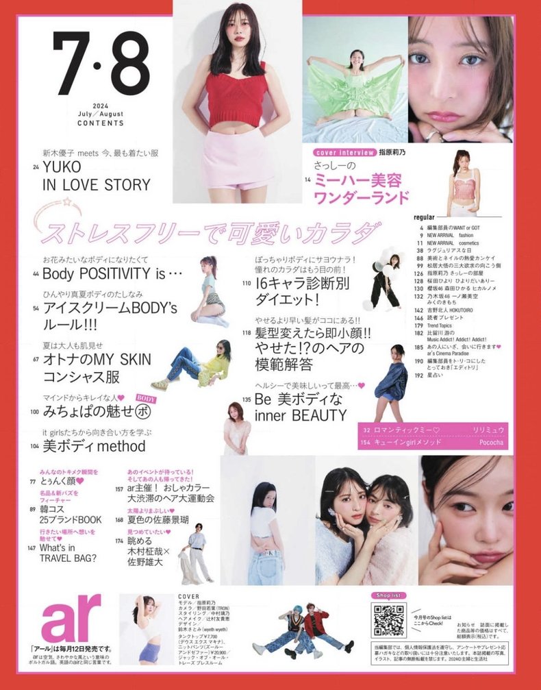 MAGAZINE 公開日 2024.6.12 / 更新日 2024.6.26 AUTHORarweb編集部 ar7・8月合併号 ar7・8月合併号のカバーは、指原莉乃さん♡ 特集は “ストレスフリーで可愛いカラダ”! SHARE ar7・8月合併号のカバーは、指原莉乃さん♡ 特集は “ストレスフリーで可愛いカラダ”! ar7・8月合併号