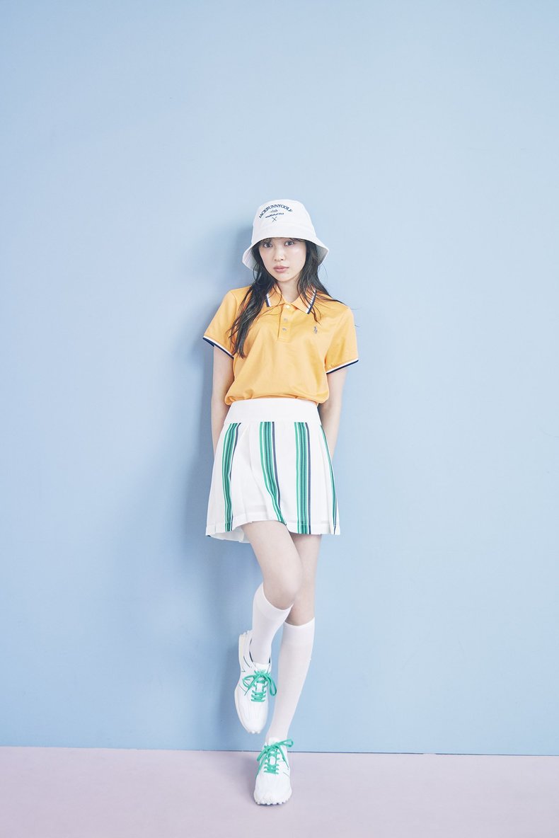 高発色なオレンジとグリーンの組み合わせが季節感満点。スカートは、マイクロメッシュに載せたスポーティーなマルチストライプがイマドキでGOOD。立体感のあるボックスプリーツが作り出すメリハリシルエットも魅力的~。