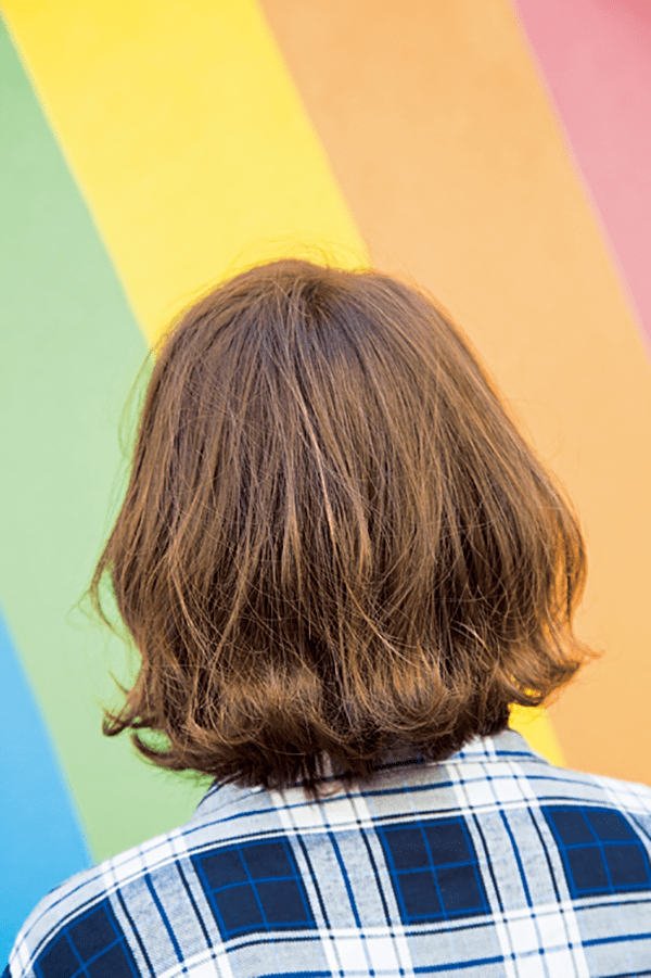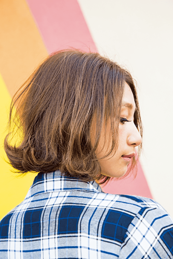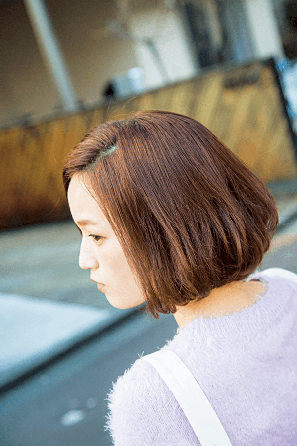 あご下のワンレンボブは、あまり軽くせずにボリュームを残すこと。毛先にランダムで大胆なハネをつくり、ラフな質感にチェンジ。前髪を全体より少し短めにしているから、どこで分けても可愛くできて、どんな印象にも転べるのがポイント。コクありカラー+ハイライトテクで、立体感もバッチリ! モデル/ニーニャさん