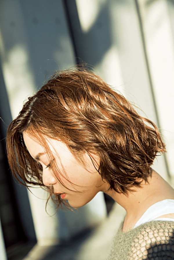曲線を生かしたシルエット+毛先のハネ感で、フェミニンさとカジュアル気分が共存。抜け感を出すために、髪がたまりやすい部分をしっかり毛量調節しておくのがコツ。ミックス巻きの動きを加え、ルーズにメイク。グラデーションやハイライトカラーで、しなやかな動きを強調してアンニュイに。モデル/藤本亜美さん