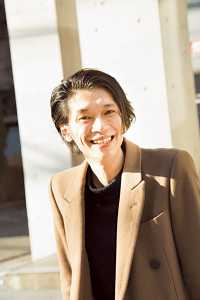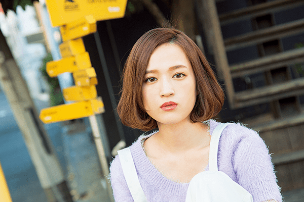 長い前髪のタンバルモリなら、気になるフェイスラインをカバーしながら、色っぽさもチラリ。グラデーションを加えて内巻きワンカールで表情をつけ、暖色のアプリコットベージュをワンメイク。ツヤの映えるシンプルなボブは、ピュアで上品な雰囲気。どんな顔立ちの人もオシャレ見え確実なスタイル。モデル/塚田 萌さん