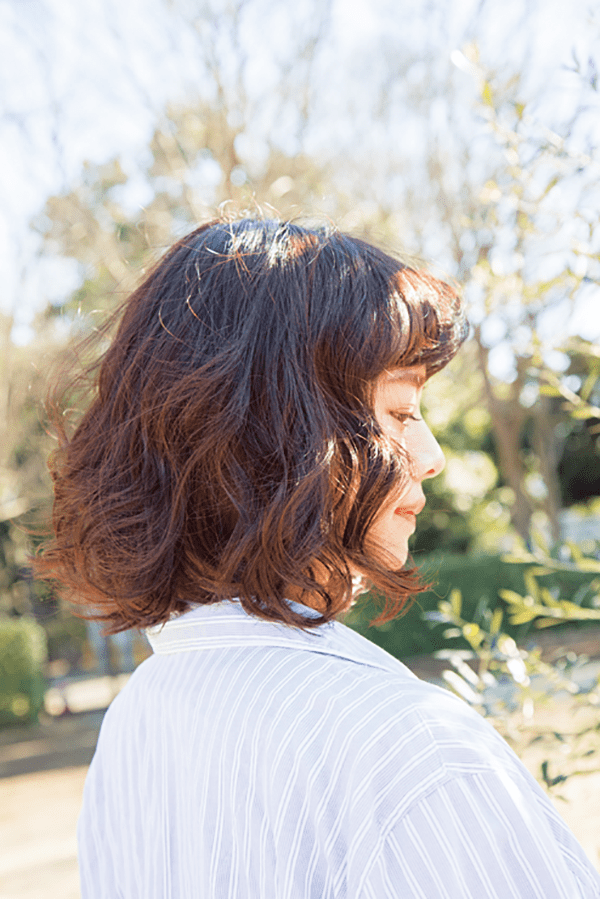 パーマやカラーのチョイスでいろんな魅力を表現できるのが、タンバルモリのいいところ。重さを残してあご下で平行ラインのベースをつくり、レイヤーを少々加えて。内巻き+平巻きスパイラルのパーマを施し、いい感じの軽さに調整。フロントに入れたハイライトが、かき上げバングと好相性。モデル/関谷かりんさん