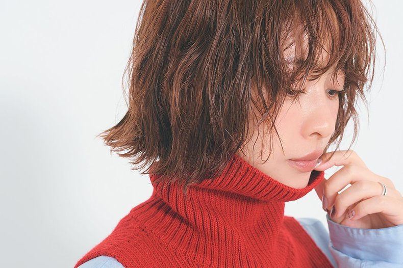 顔まわりにかかる毛束や前髪の透け感など戦略的にリフトアップ効果を狙いたい。顔の見え方がひし形になるよう前髪は長め&スキマを意識してつくり、顔まわりのレイヤーへつなげて入れる。さらに毛先を逃がしたパーマでシャープ感もオン。カットとパーマでウエイトを上げるから、首もながーく。