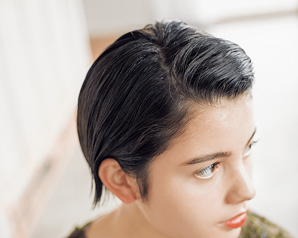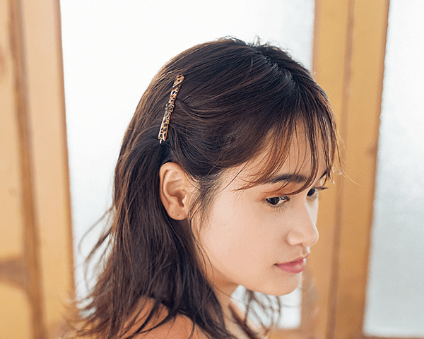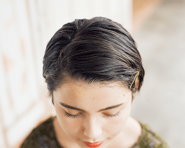 ベースは、あごラインの前下がりグラデーションボブ。細めのアイロンで毛先を軽く外巻きにして、根元~毛先にオイルをたっぷりなじませる。ウエット感が出た髪を8:2のサイドパートにして、根元を立ち上げながらタイトになでつける。コームでキレイになでつけるのがコツ。サイドは両耳にかけてコンパクトにし、分け目と逆サイドの耳上をゴールドのピンで留める。毛先の外ハネはそのまま生かし、ちょっとした遊びに。