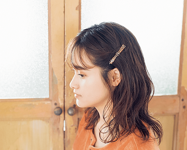 ベースは、鎖骨下のミディアムレイヤーにゆるーくウエーブパーマがかかっている状態。直毛の人は25㎜のアイロンで、全体をあらかじめ巻いておきましょう。たっぷりとオイルをなじませ、ウエットな質感にチェンジ。前髪を薄く残してからざっくりとセンターに分け、両サイドの髪をねじり上げて飾りピンで留めるだけ。懐かしい雰囲気が漂うアレンジだけど、ウエットな質感にしていることで〝今〞が融合されて新しい印象です!