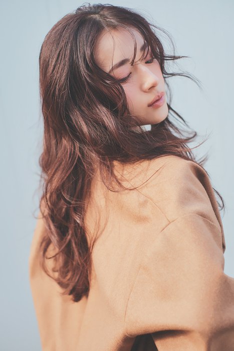 パープル系カラーでツヤ感を出した落ち着きのあるロングに、柔らかなウエーブをまとわせてヌケ感をアップ。とくに顔まわりにくるんと強めのカールをつけることで、主張のある可愛さもしっかりオン。太さの異なるアイロンでミックス巻きにしたあと、クッションブラシで毛束をほぐして、触れたくなるような柔らかな質感に。