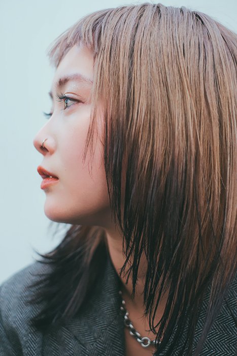 髪色はシックだけど、しっかり攻めた個性派長めボブ。顔まわりにハイレイヤーを入れ、前髪はオン眉2㎝×ザクザクのベビーバングに。全体をブリーチ後、クリーミーベージュでカラーし、毛先にのみ暗めのチェスナッツブラウンのエンドカラーをオン。少量のバームとオイルを混ぜて、バサッとドライな仕上がりに。