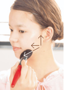 チークブラシで耳前の頬骨のくぼみから内側へ、手首のスナップを効かせてシュッと払うようにのせる。輪郭は指でなぞってぼかし込んで。