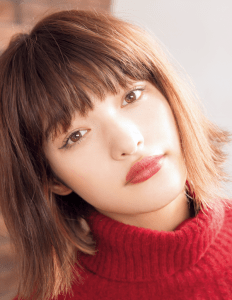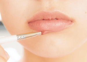 リップを筆にとり、唇の山と底の輪郭をオーバー気味に描き、口角からつなげて内側に塗る。唇中央に同系色のグロスものせてでふっくら感を。