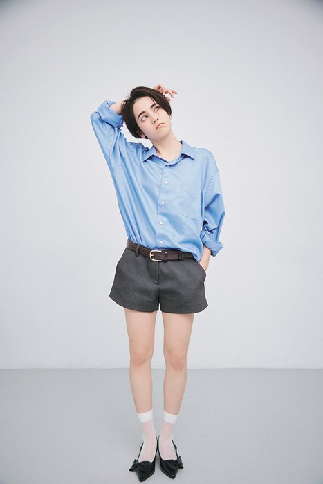 色気もクールさも備えた中性的な雰囲気が魅力。やや面長の顔型に合わせてサイドには丸みが出るようにカットし、襟足はタイトに収めることですっきりと大人っぽく。風でさらっとなびくようなドライな質感にスタイリングを。オーバーシャツとショーパン、髪型とのトータルコーデもおしゃれ。
