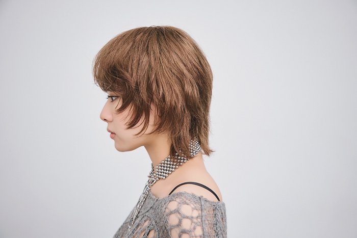 軽やかなハイレイヤーとスモーキーなベージュカラーの組み合わせが、甘さを抑えたハンサム感のカギ。襟足を長めに残したショートに、顔まわりのレイヤーでザクッとした束感をプラスし、シャープな仕上がりに。前髪のサイドを抑えて角をつくり、丸くなりすぎないようにスタイリングするのもポイント。