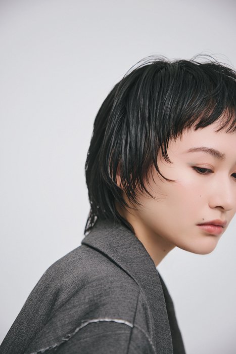ジェンダーにとらわれず〝自分らしさ〞を表現したオン眉のパッツンショートボブ。目元をはっきり出すように前髪と顔まわりをザクザク切り込み、バックは襟足を少し長めに残して中性的な印象に。オイルをつけ、ジェルでウエット感を出すようにスタイリングすれば、スッキリしたカッコよさの完成。