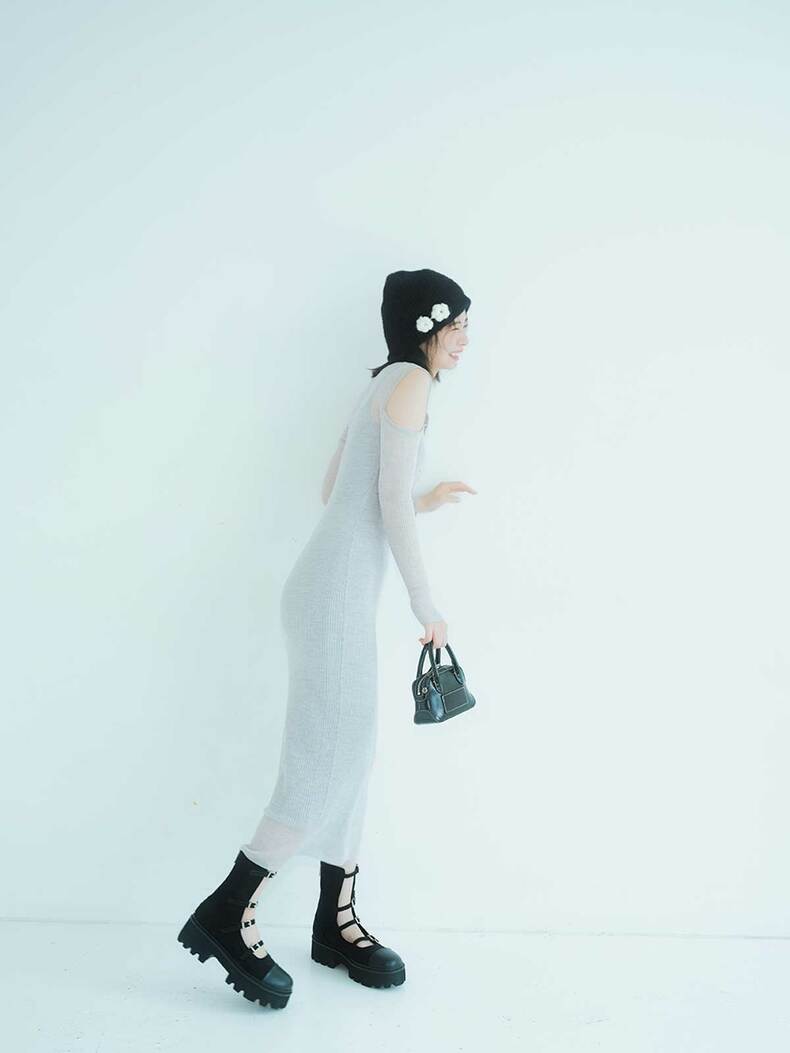 残暑と肌寒さが入り交じるこれからの季節は、グレーのシアーニットワンピが大活躍。タイトめでボディラインが引き立つから、シャツやジャケットを羽織ってもスマートな印象をキープできる。オープンショルダーの肌見せ具合が絶妙で軽やかなぶん、黒のベルトブーツとニット帽の小物で重みを持たせ、秋につながる先取りコーデに。