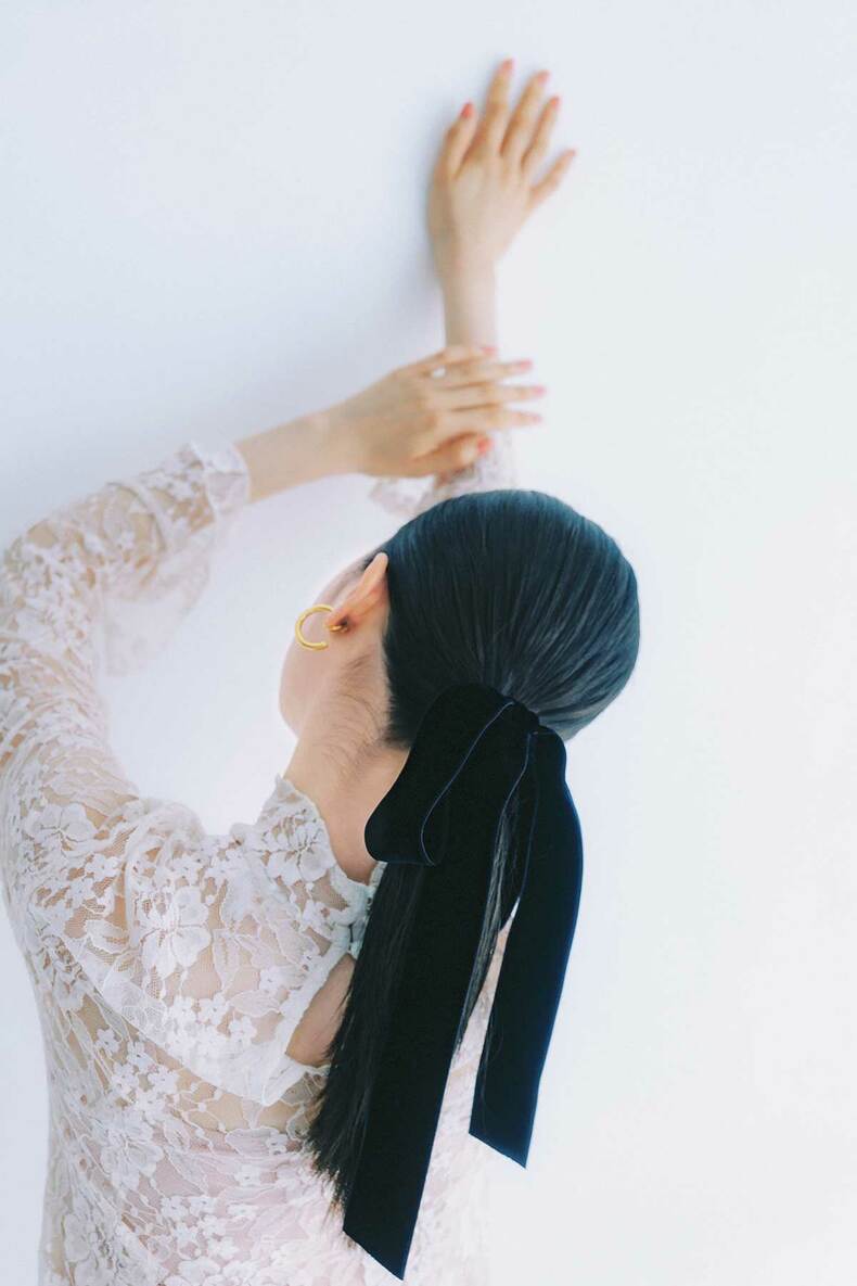 髪にバームをつけたらクッションブラシで全体をなでつけてなじませ、耳の下の高さでゴムで結び、上からリボンをON。あえてリボンの長さをアシンメトリーにするのが、後ろ姿もこなれ見えするポイント。