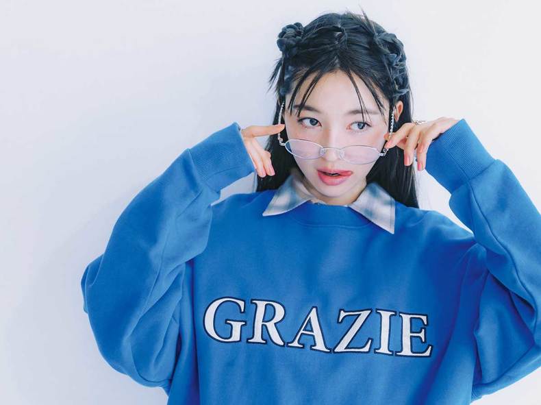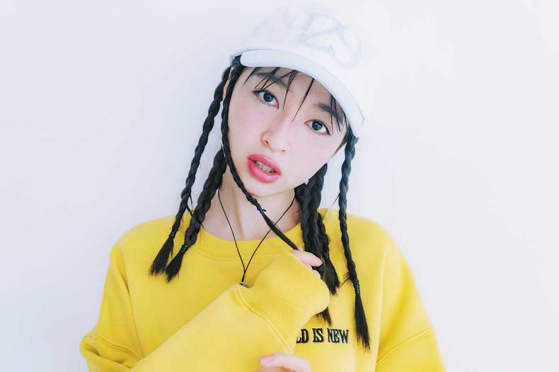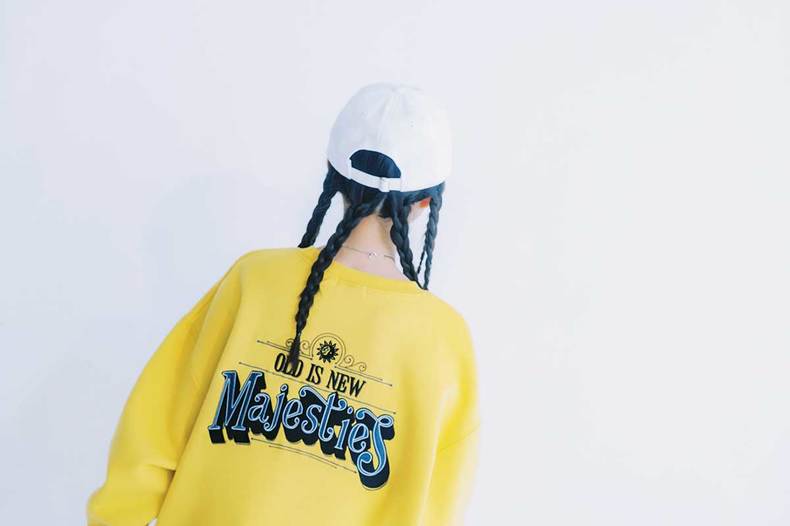 パキッとした派手色とバックの刺繍ロゴが主役級に目立つスウェットの日は、髪型をおとなしくまとめるなんてナンセンス! 6本のみつあみ+キャップでアッパーなオーラをまとっちゃいましょ。