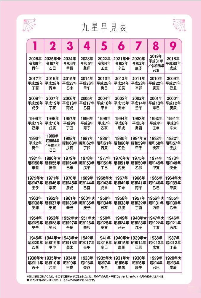 ※暦は旧暦に基づくため、その年の節分までに生まれた人は、前の年の九星・干支になります。★のついた年の節分は2月4日、◆ のついた年の節分は2月2日、それ以外の年は2月3日です。